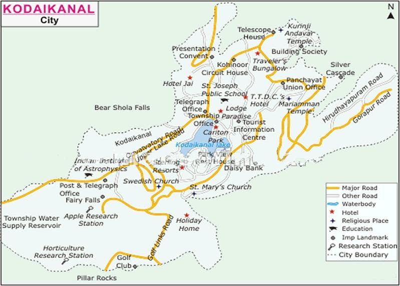 Kodaikanal Travel Map, Kodaikanal City Map, Kodaikanal Tourist Map