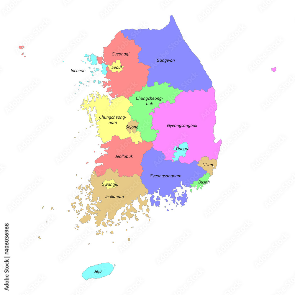 South Korea map. Designed in illustration with the regions colored